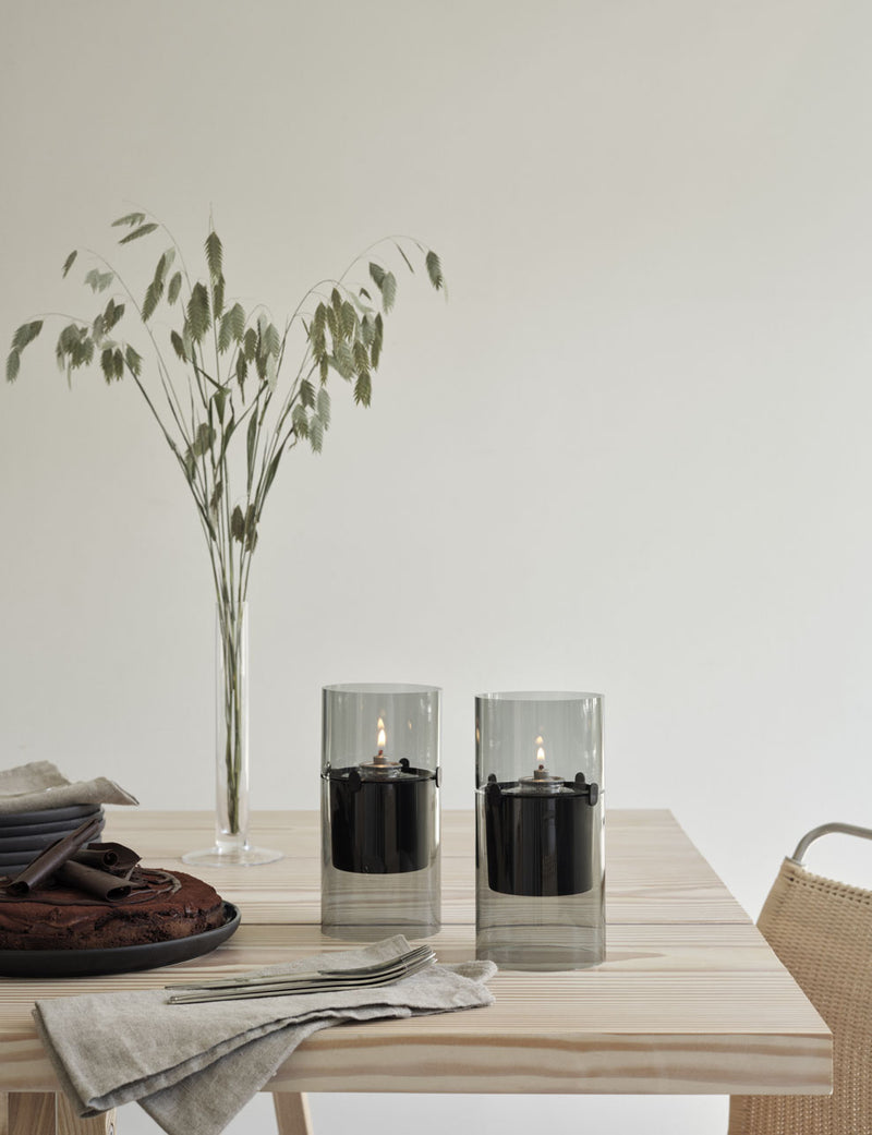 Lucie hurricane is made in durable borosilicate glass in a number of attractive shades that draw inspiration from nature: “Smoke”, reminiscent of the smoke from a bonfire that has just been extinguished; “Amber”, like amber polished by the sea for thousands of years; and “Azure”, as deep blue as the ocean. When the candle’s flame dances behind the glass, an enchanting ambience and glow is created.