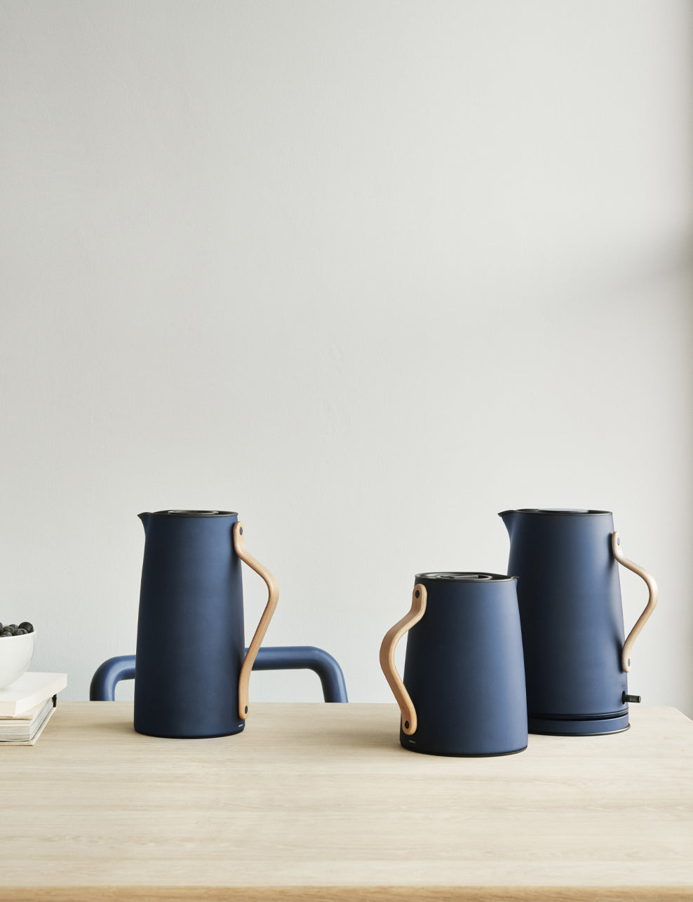 The Emma vacuum jugs for coffee and tea as well as the elegant electric kettle are all made of lacquered stainless steel with a moulded beech wood handle. The idea was to design an electric kettle beautiful enough to place directly at the table. The warmth of the FSC-certified wood and the carefully selected colors lend the design its Nordic and minimalistic look.