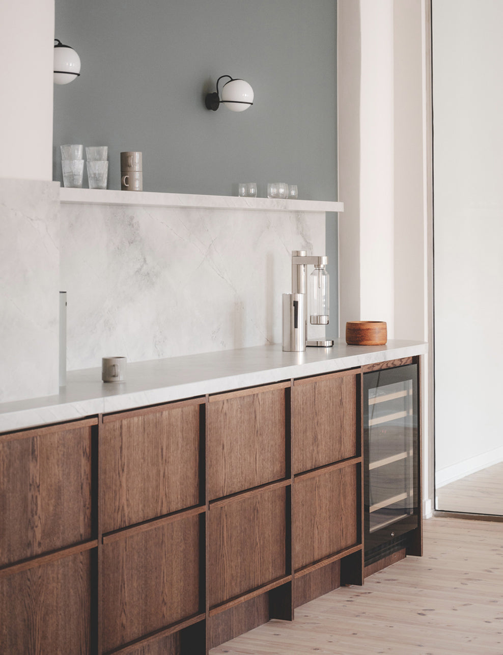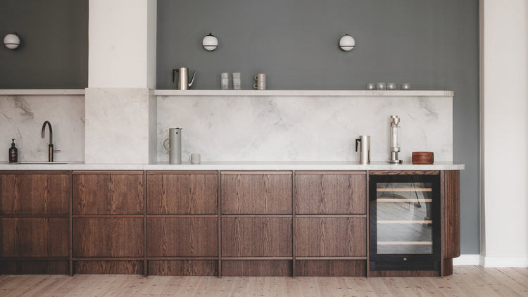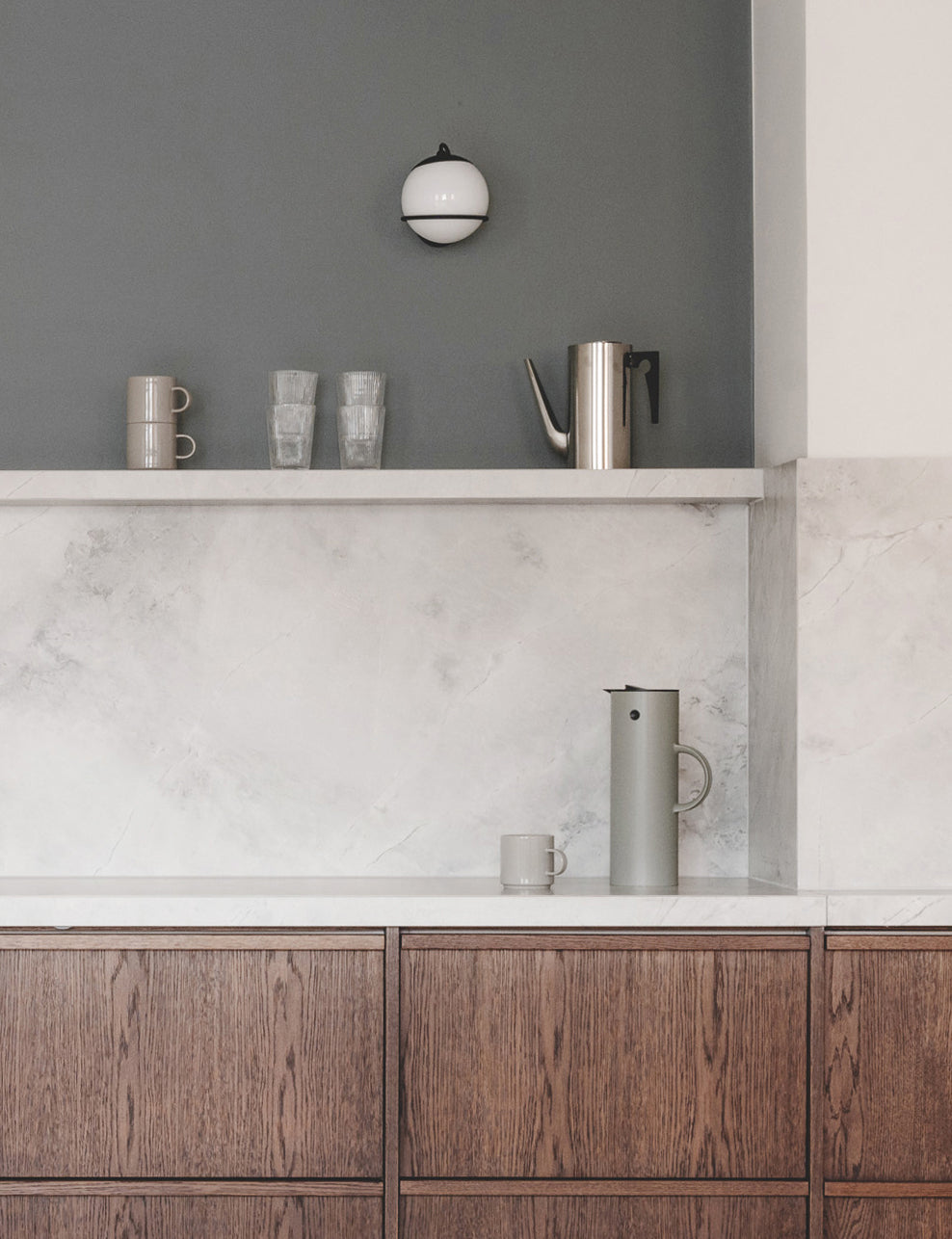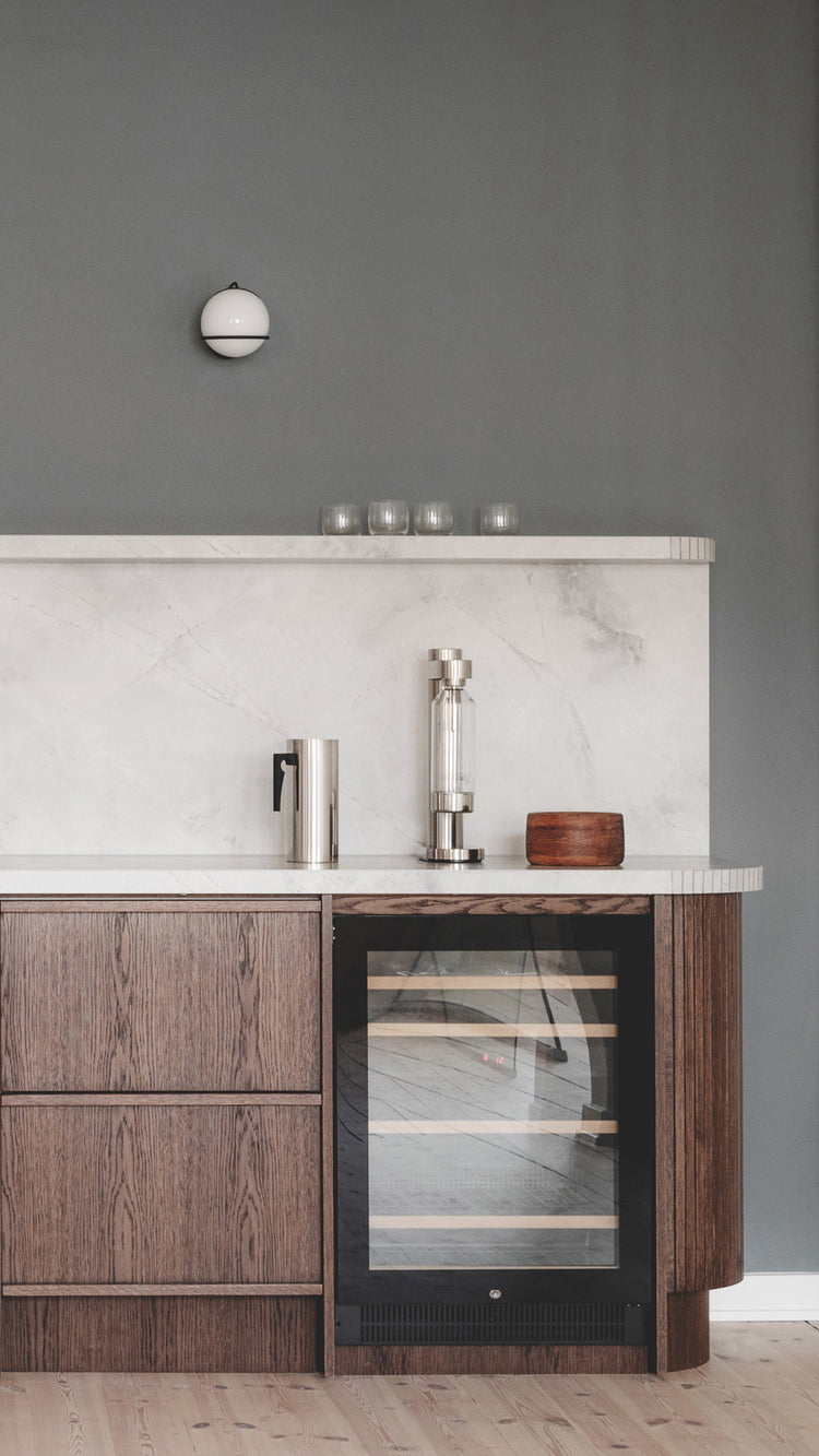 In this kitchen styled by Allan Torp for Copi, the sleek design of Stelton’s Cylinda-line complements the rich wood cabinetry and marble backsplash. Allan’s approach blends simplicity and elegance, resulting in a timeless yet functional space.